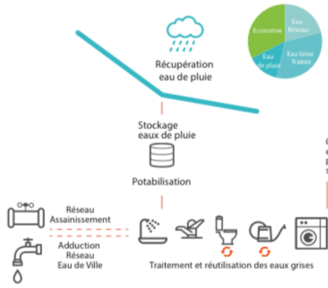 L’eau de pluie est collectée via les panneaux solaires, stockée et potabilisée pour être intégrée au réseau d’eau potable des logements pour alimenter douches, lavabos, éviers, lave-vaisselle et lave-linge.Les eaux grises sont également récupérées, traitées et réutilisées dans les toilettes des logements et pour l’arrosage des jardins partagés.